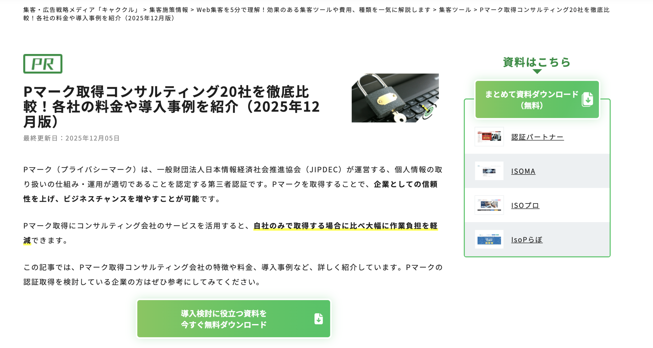 Zenken株式会社が運営するマーケティングメディア『キャククル』にて、弊社サービスをPRいたしました。 掲載記事は、こちらよりご覧いただけます。 Pマーク取得コンサルティング20社を徹底比較!各社の料金や導入事例を紹介…