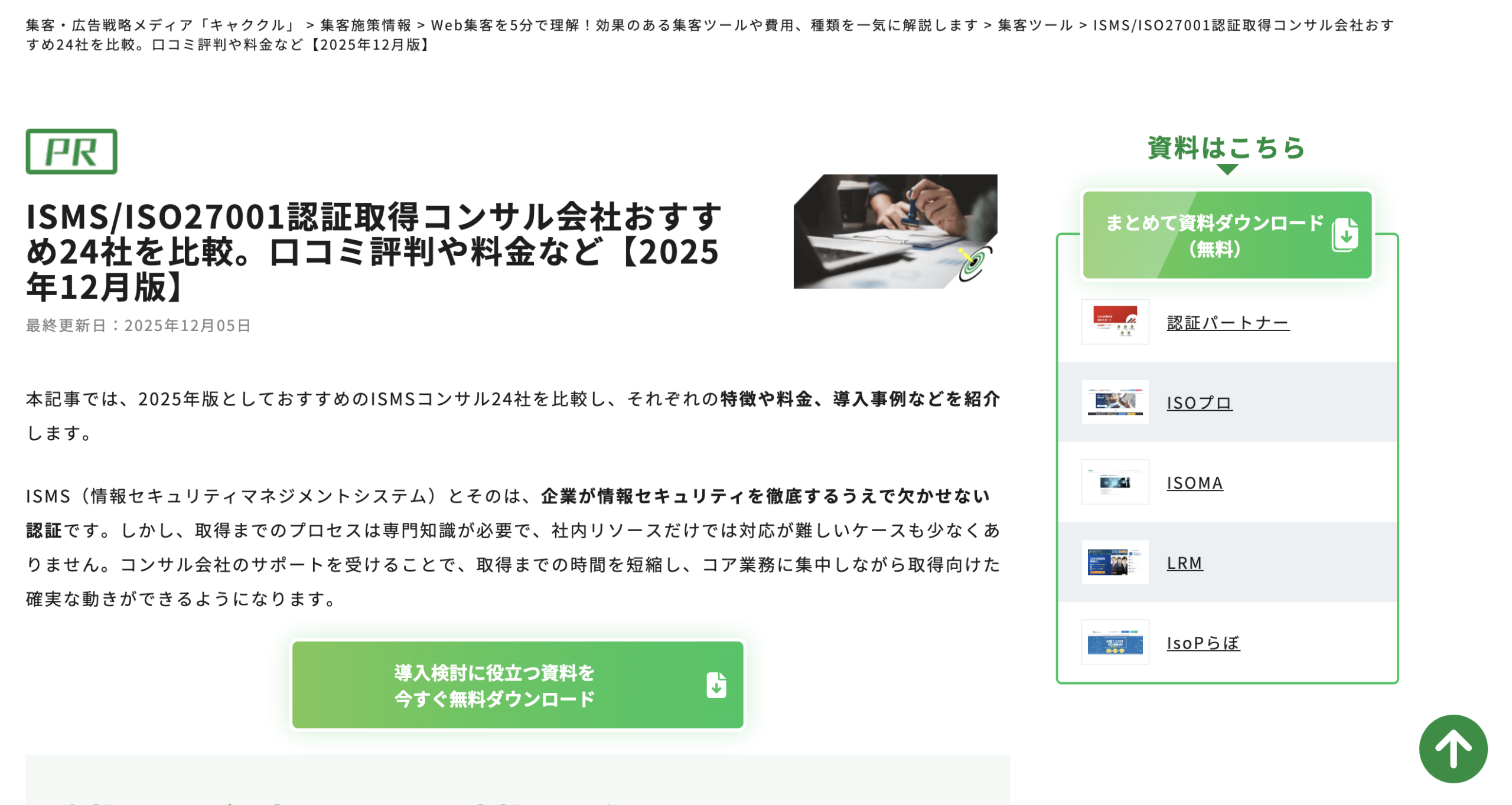 Zenken株式会社が運営するマーケティングメディア『キャククル』にて、弊社サービスをPRいたしました。 掲載記事は、こちらよりご覧いただけます。 ISMS/ISO27001認証取得コンサル会社おすすめ24社を比較。口コ…
